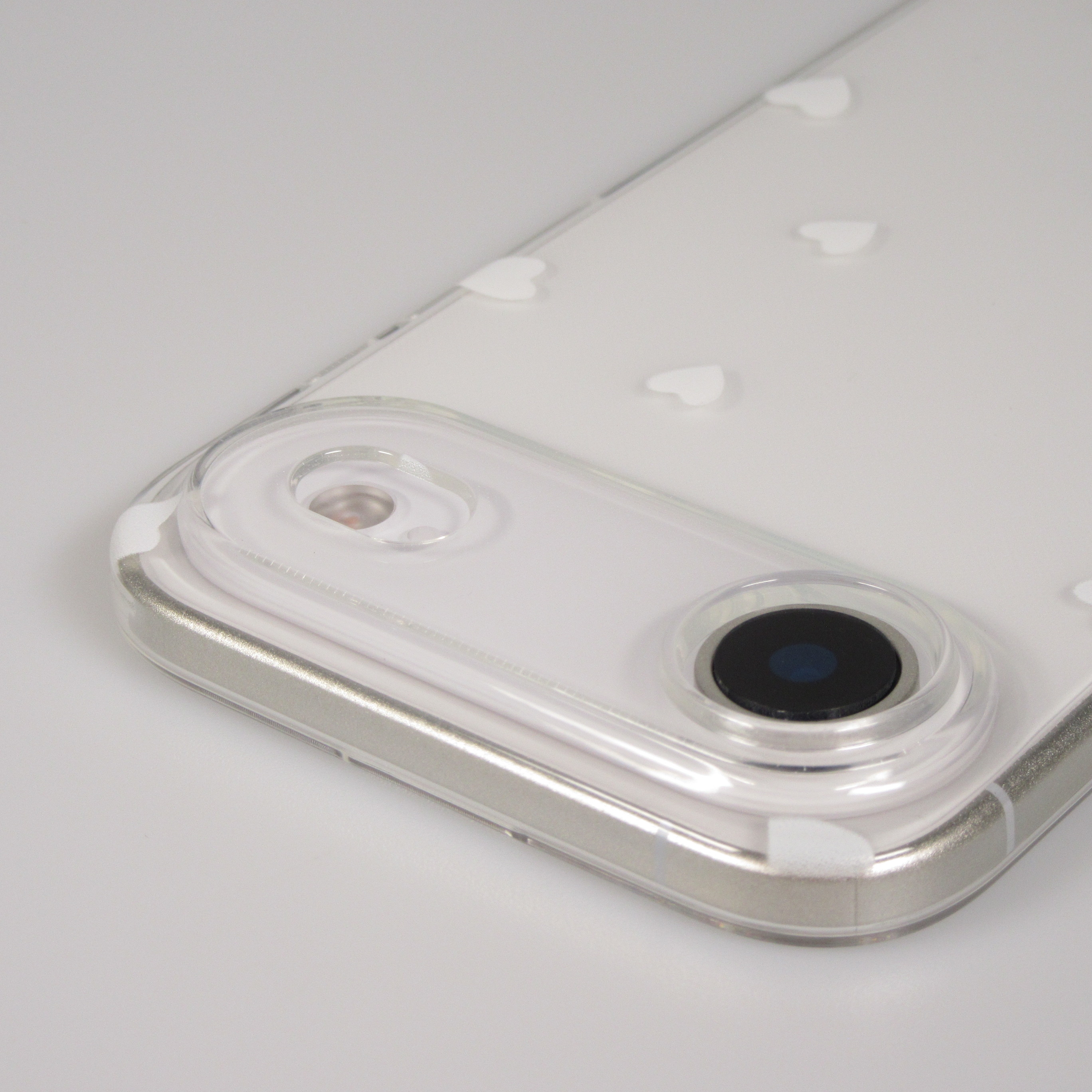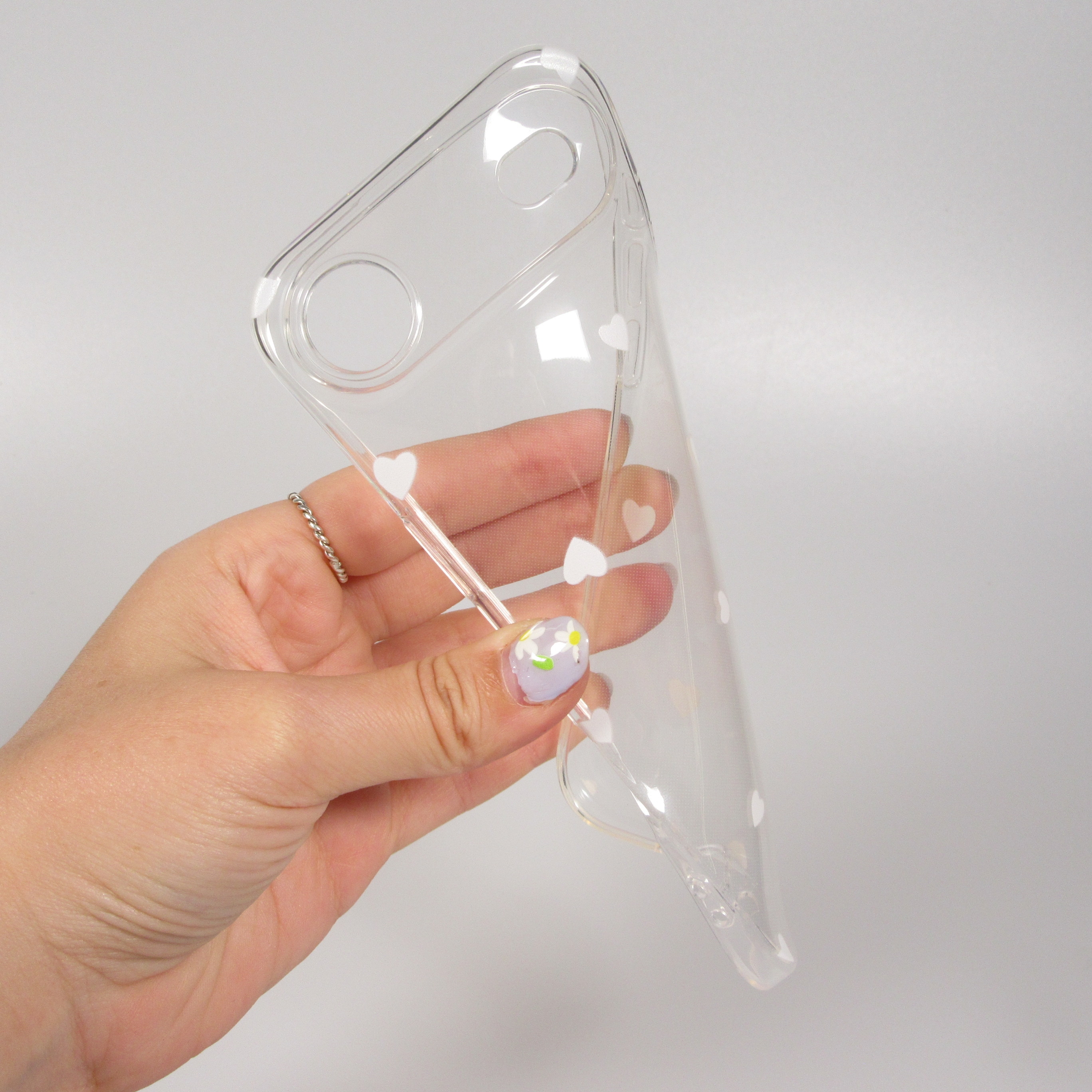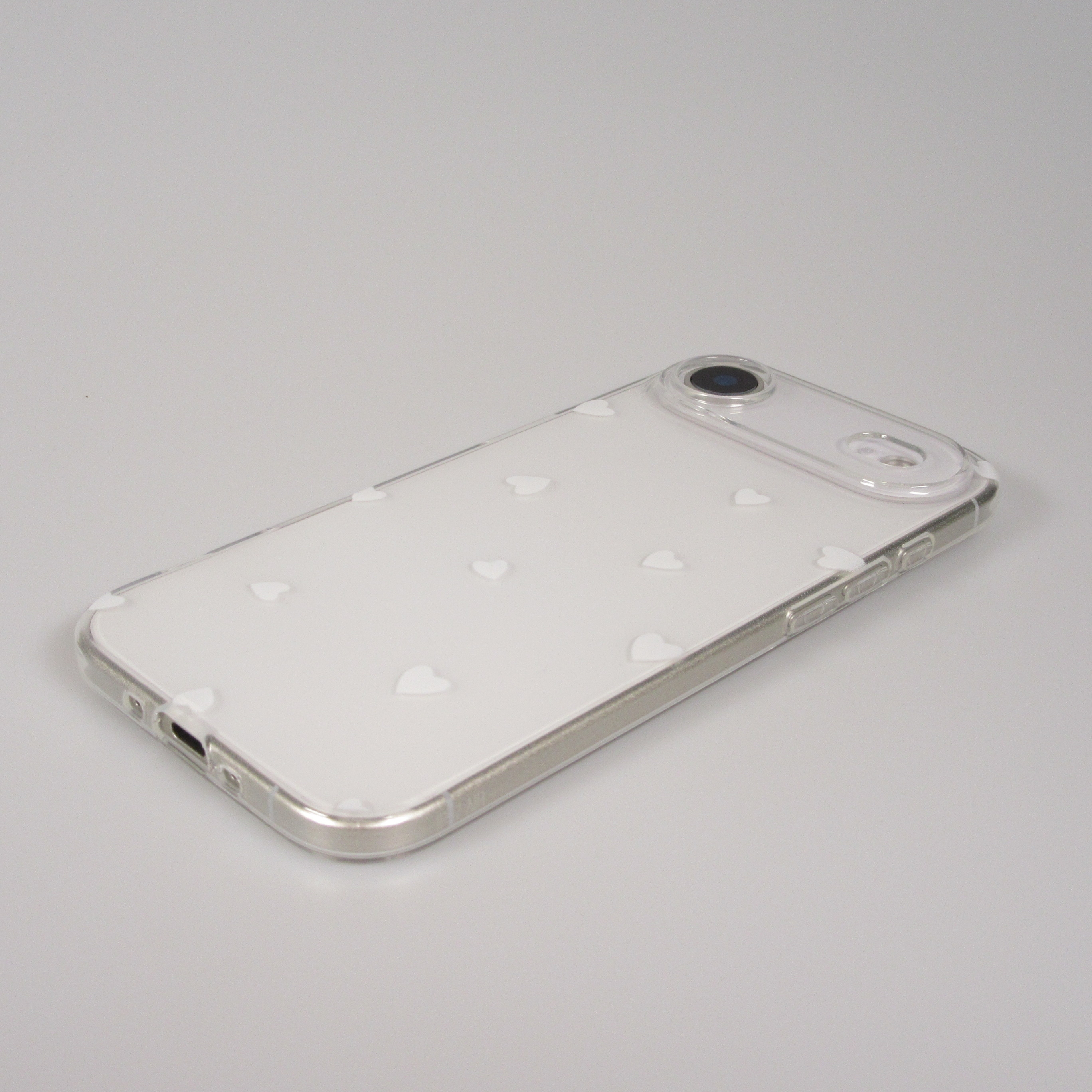 Coque très populaire en gel transparent avec des petits cœurs. Elle protège discrètement le smartphone contre les rayures et les chutes et lui donne une touche de charme.